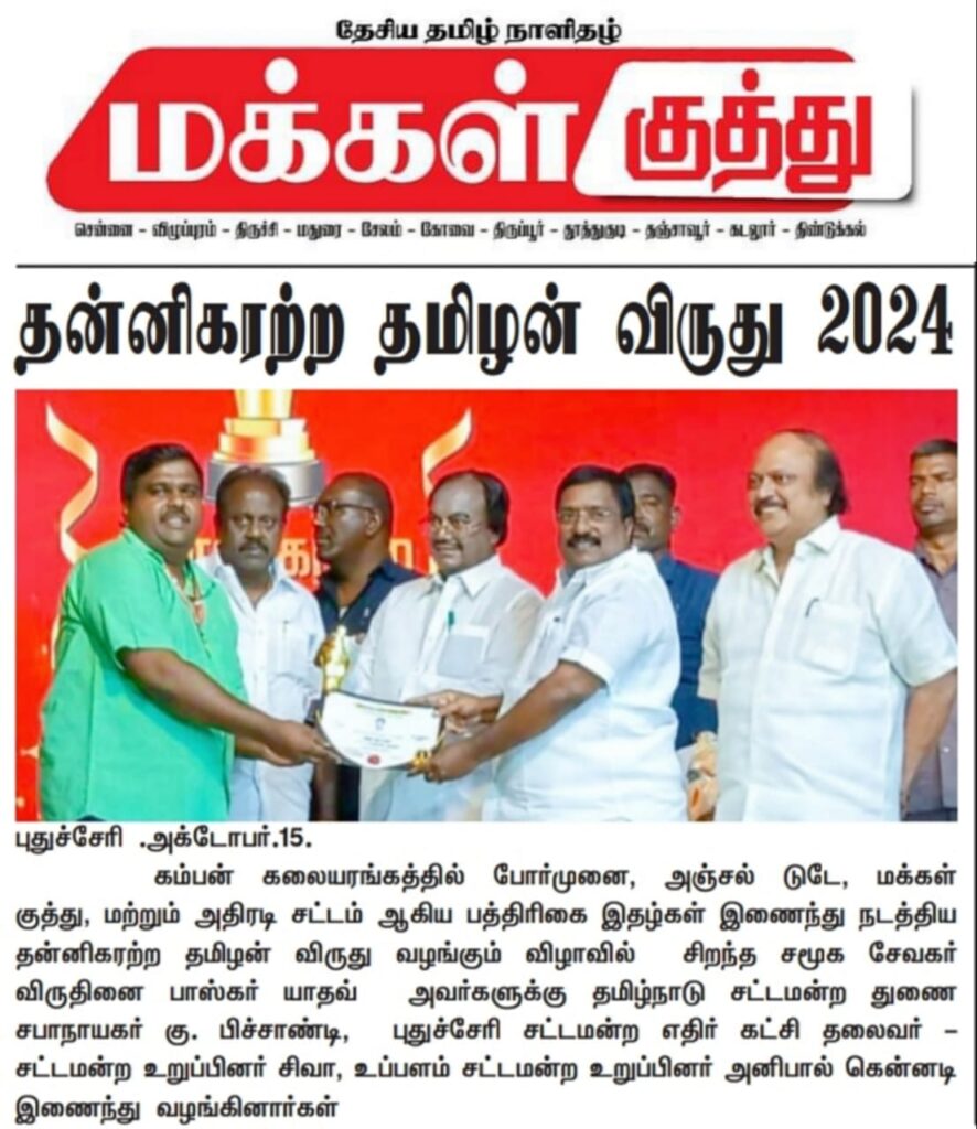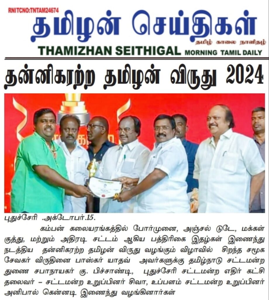 கம்பன் கலையரங்கத்தில் போர்முனை, அஞ்சல் டூடே, மக்கள் குத்து, மற்றும் அதிரடிச் சடாம் ஆகிய படங்களில் நடித்துத் தன்னிகரற்ற தமிழன் விருது வழங்கும் விழாவில் சிறந்த சமூக சேவையாளர் விருதினைப் பாலகர் யாதவ் அவர்களுக்கு தமிழ்நாடு சட்டமன்ற துணை சபாநாயகர் கு. பிச்சைபாண்டி, புதுச்சேரி சட்டமன்ற எதிர்க் கட்சித் தலைவர் சட்டமன்ற உறுப்பினர் சிவா, உப்பளம் சட்டமன்ற உறுப்பினர் அனிபால் கென்னடி இணைந்து வழங்கினார்கள்.