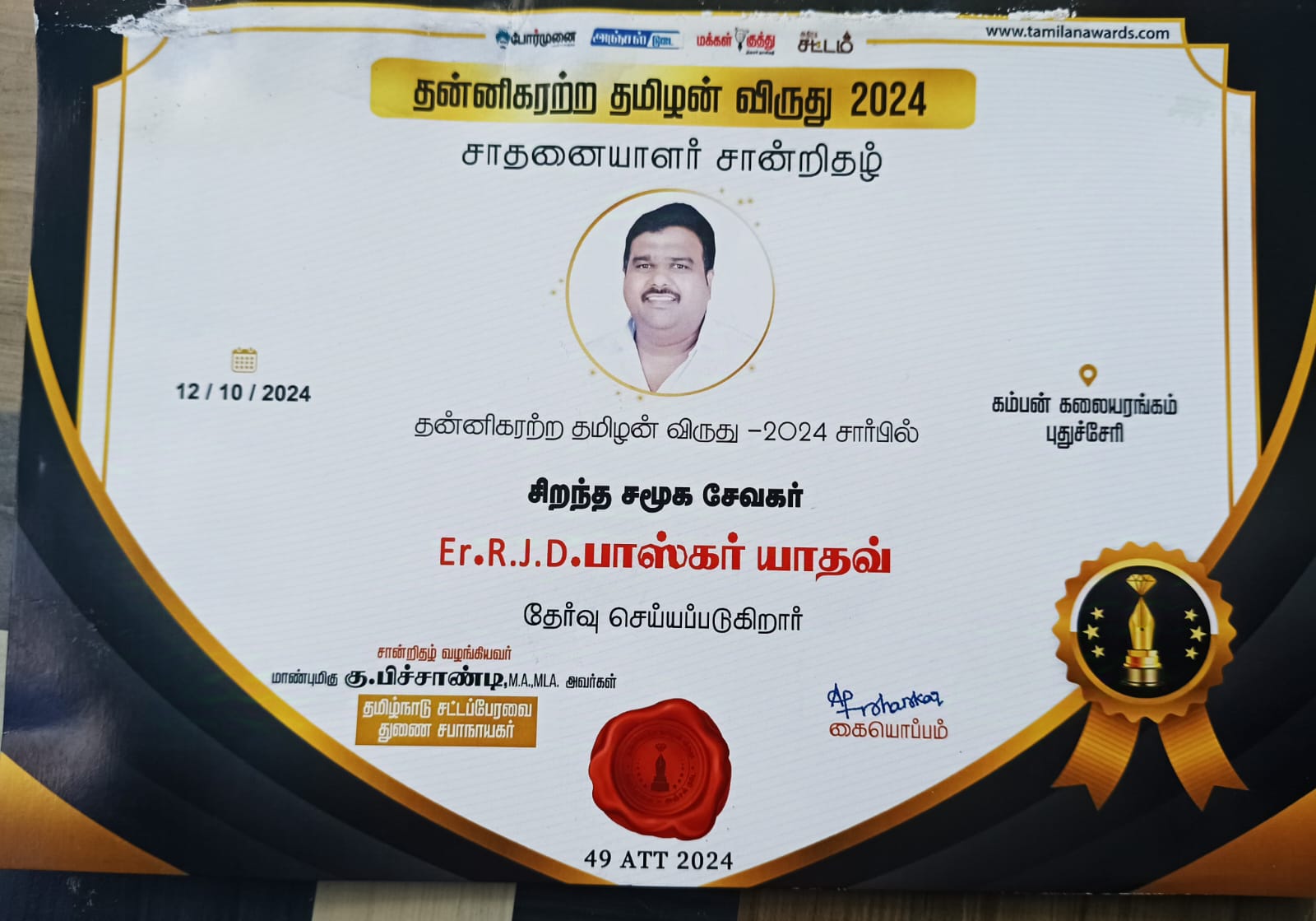 கம்பன் கலையரங்கத்தில் போர்முனை, அஞ்சல் டூடே, மக்கள் குத்து, மற்றும் அதிரடிச் சடாம் ஆகிய படங்களில் நடித்துத் தன்னிகரற்ற தமிழன் விருது வழங்கும் விழாவில் சிறந்த சமூக சேவையாளர் விருதினைப் பாலகர் யாதவ் அவர்களுக்கு தமிழ்நாடு சட்டமன்ற துணை சபாநாயகர் கு. பிச்சைபாண்டி, புதுச்சேரி சட்டமன்ற எதிர்க் கட்சித் தலைவர் சட்டமன்ற உறுப்பினர் சிவா, உப்பளம் சட்டமன்ற உறுப்பினர் அனிபால் கென்னடி இணைந்து வழங்கினார்கள்.