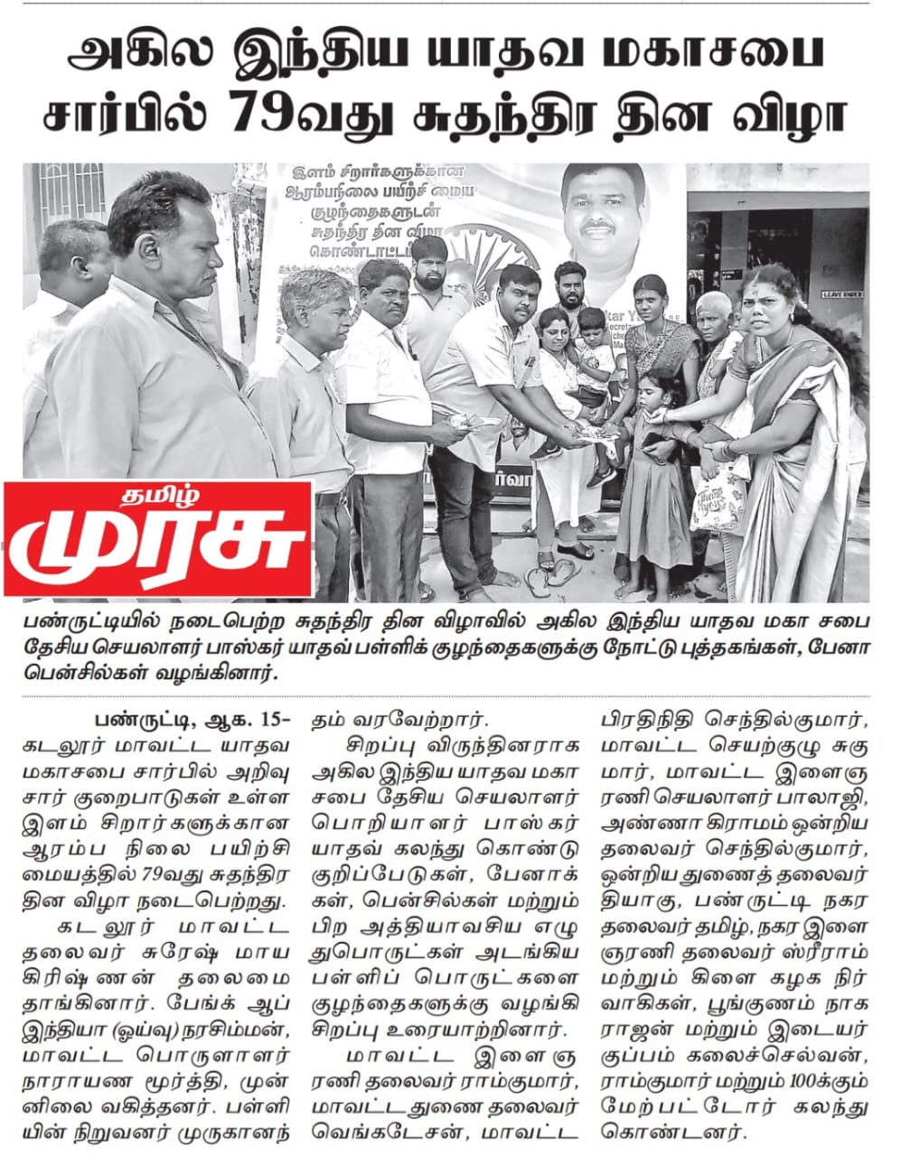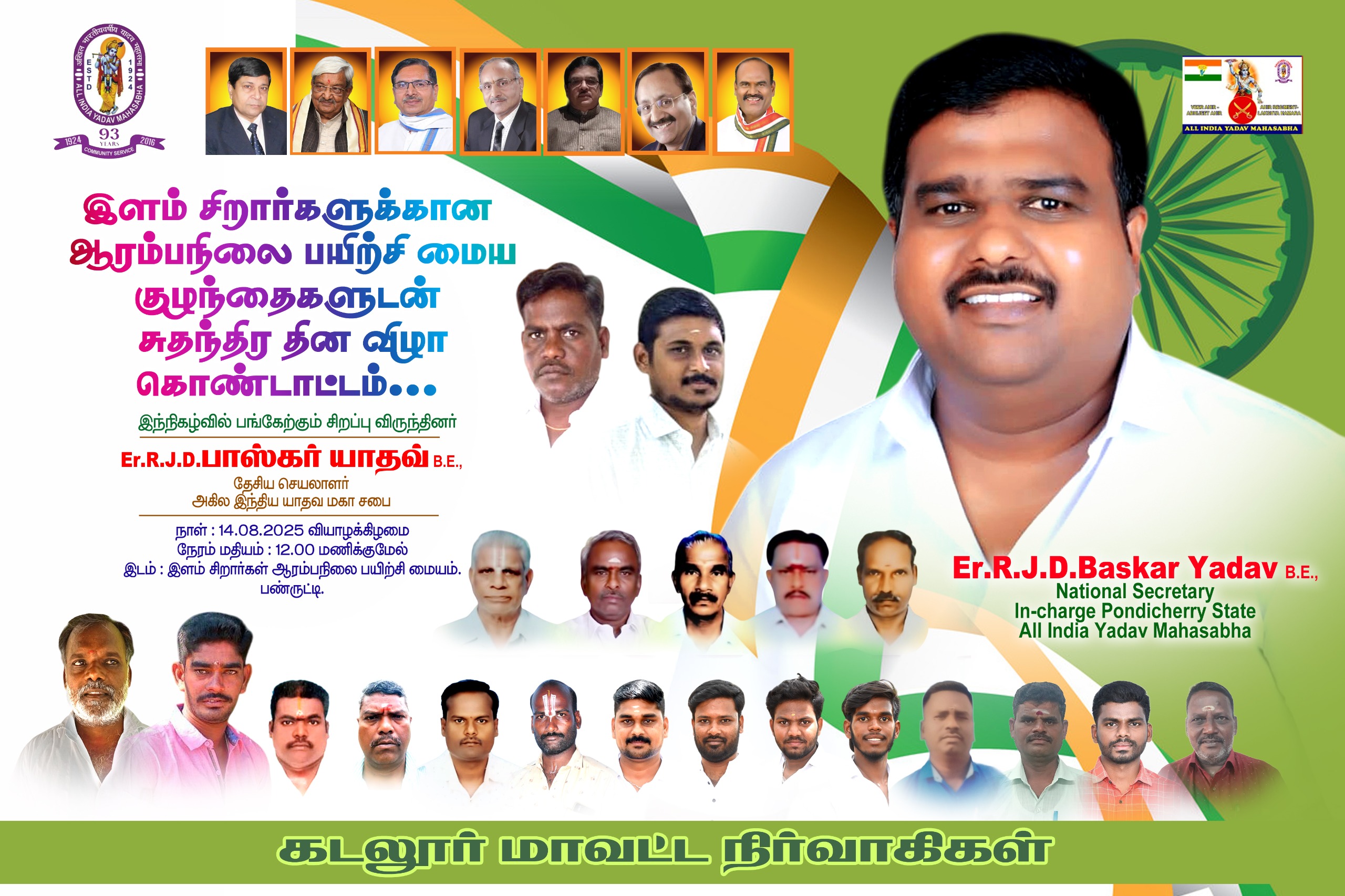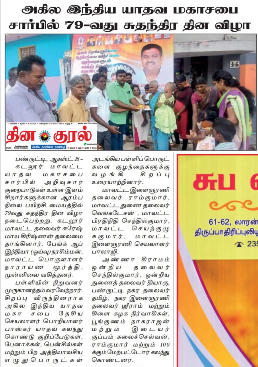 79வது சுதந்திர தினத்தின் புனிதமான நாளில், அறிவுசார் குறைபாடுகள் உள்ள குழந்தைகளுக்கான பள்ளியில் பள்ளியில் சிறப்பு விருந்தினராக அகில இந்திய யாதவ மகா சபை தேசிய செயலாளர் பொறியாளர் திரு பாஸ்கர் யாதவ் அவர்கள் கலந்து கொண்டு விழாவில் குழந்தைகளுடன் சுதந்திர தின விழா கொண்டாடப்பட்டது. அங்கு தேசபக்தி உற்சாகத்துடனும், மனமார்ந்த உற்சாகத்துடனும் இந்த நாள் கொண்டாடப்பட்டது. இந்த நிகழ்ச்சியில் சுதந்திரம் மற்றும் ஒற்றுமையின் உணர்வை அழகாக பிரதிபலிக்கும் கலாச்சார நிகழ்ச்சிகள் மற்றும் செயல்பாடுகள் இடம்பெற்றன.
